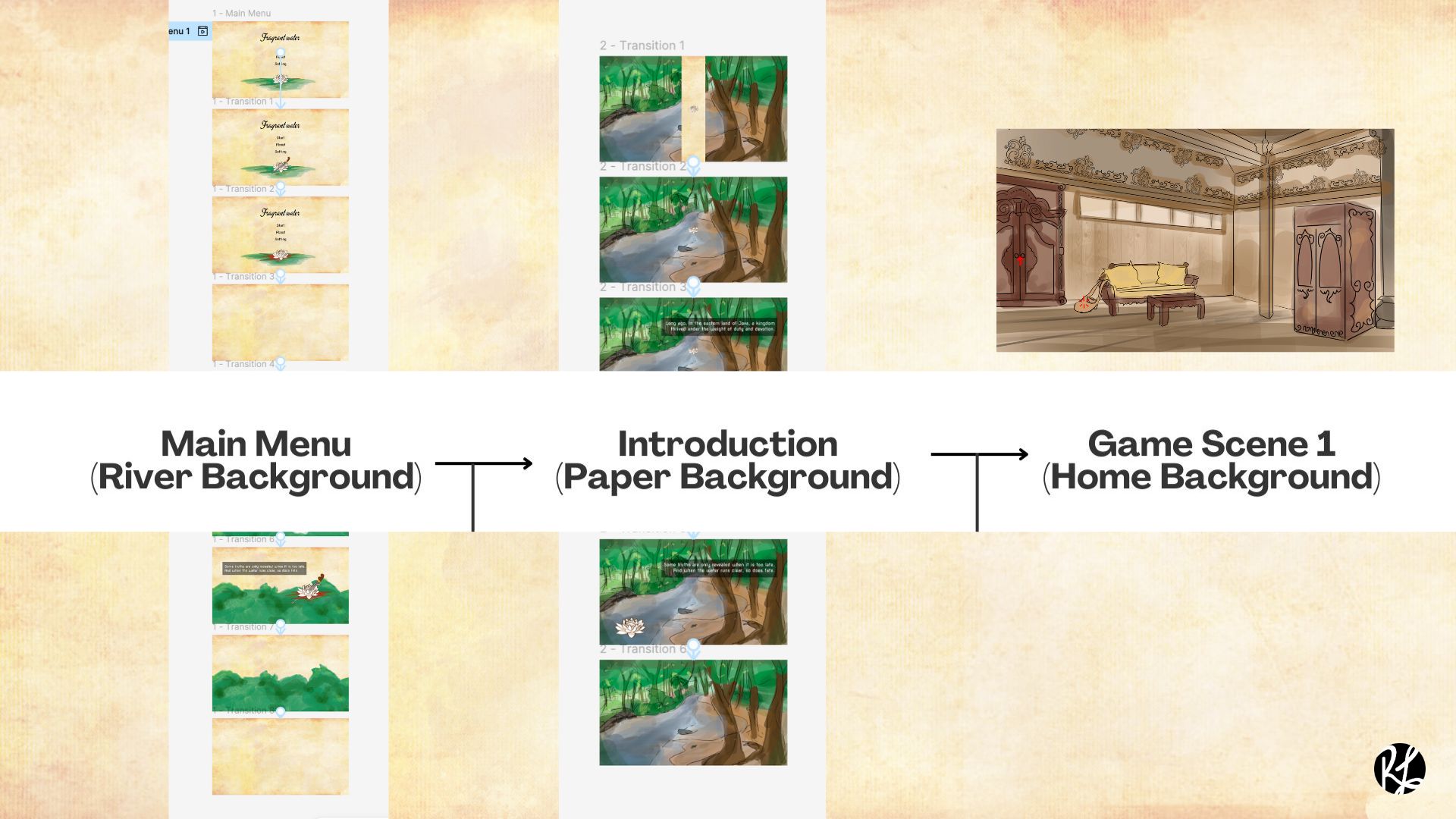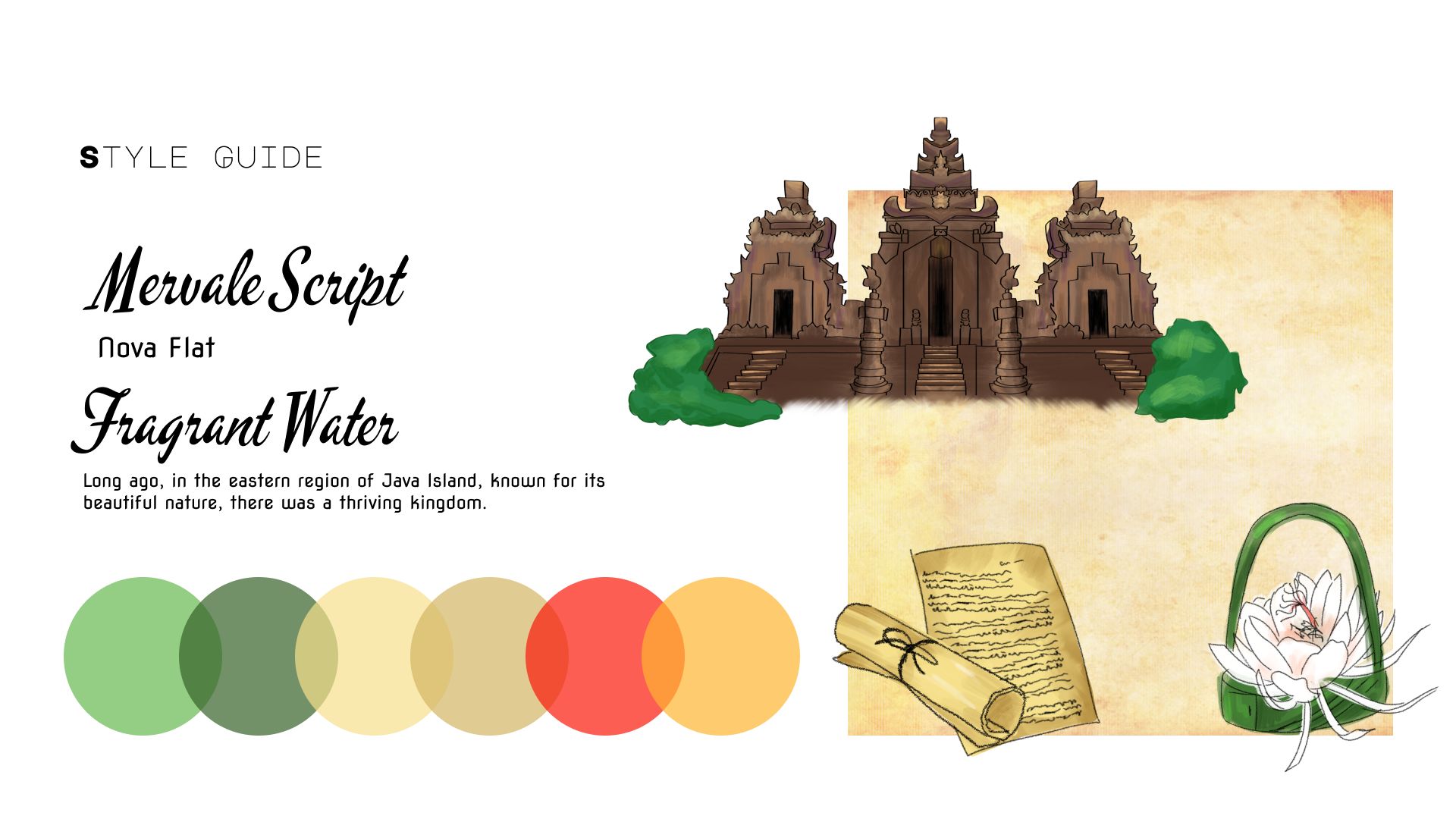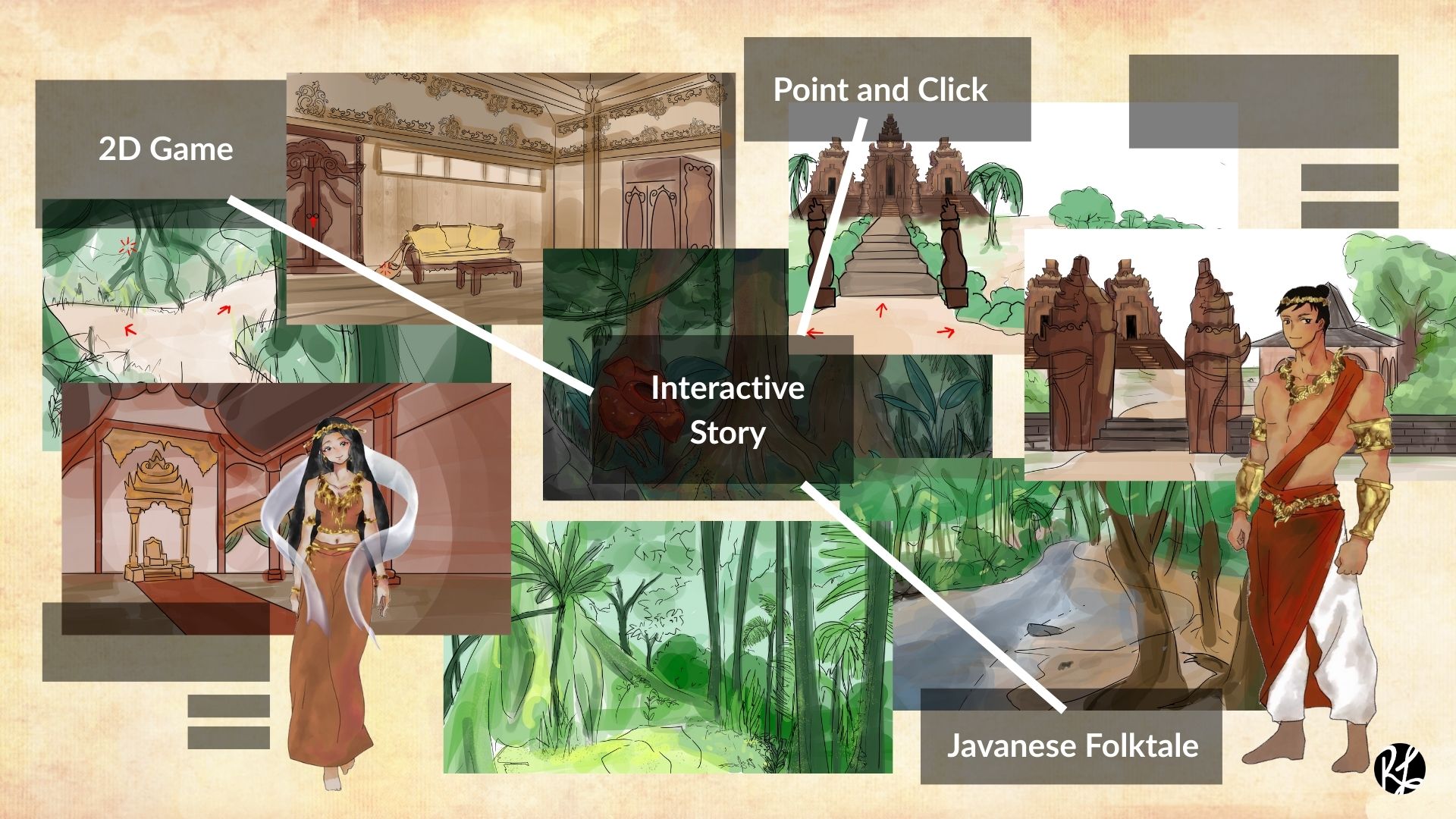 Fragrant Water is based on a Javanese folktale called “Asal Usul Banyuwangi”, which is believed to be the origin story of the Banyuwangi town. Like most folktales, this story also exists in multiple versions circulated within society. Therefore, a narrative design treatment is needed to translate it into interactive media such as a game. During the preproduction of the game, the narrative for the game evolve from the original folktale, to several points of view.