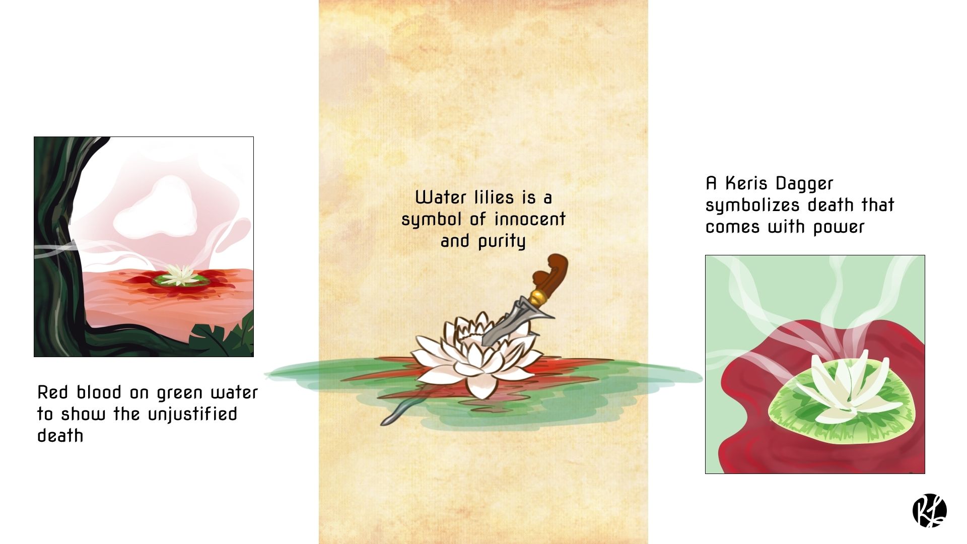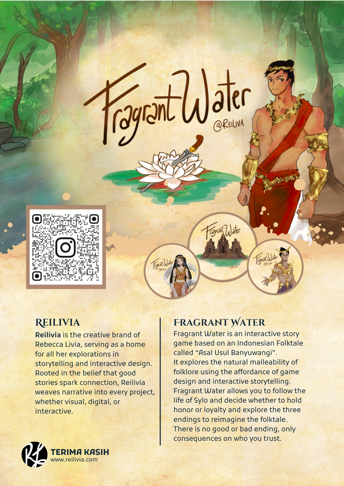Fragrant Water is an interactive story game based on a Javanese Folktale called “Asal Usul Banyuwangi”. It explores the natural malleability of folklore using the affordance of game design and interactive storytelling. Fragrant Water allows you to follow the life of Sylo and decide whether to hold honor or loyalty and explore the three endings to reimagine the folktale.