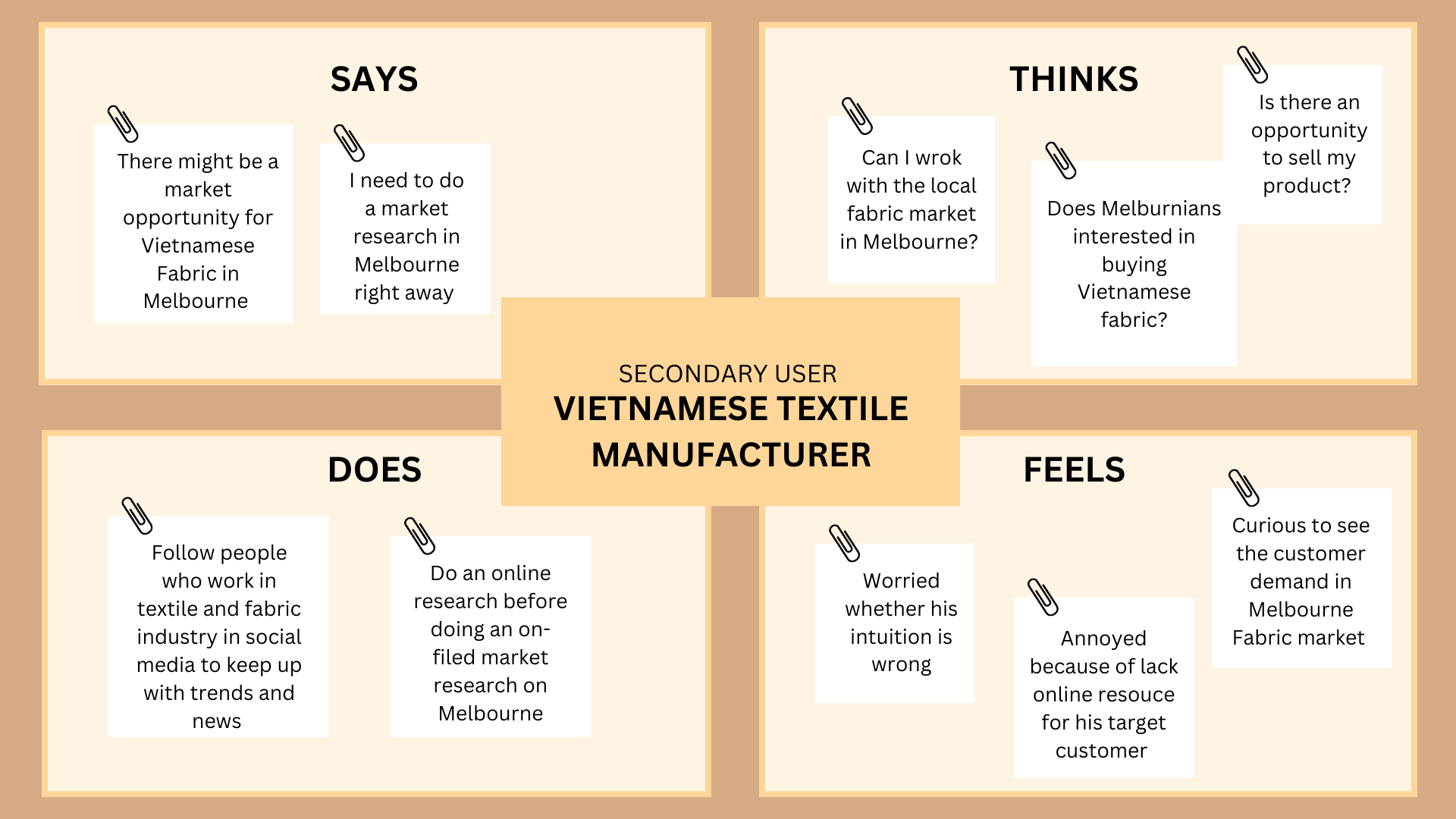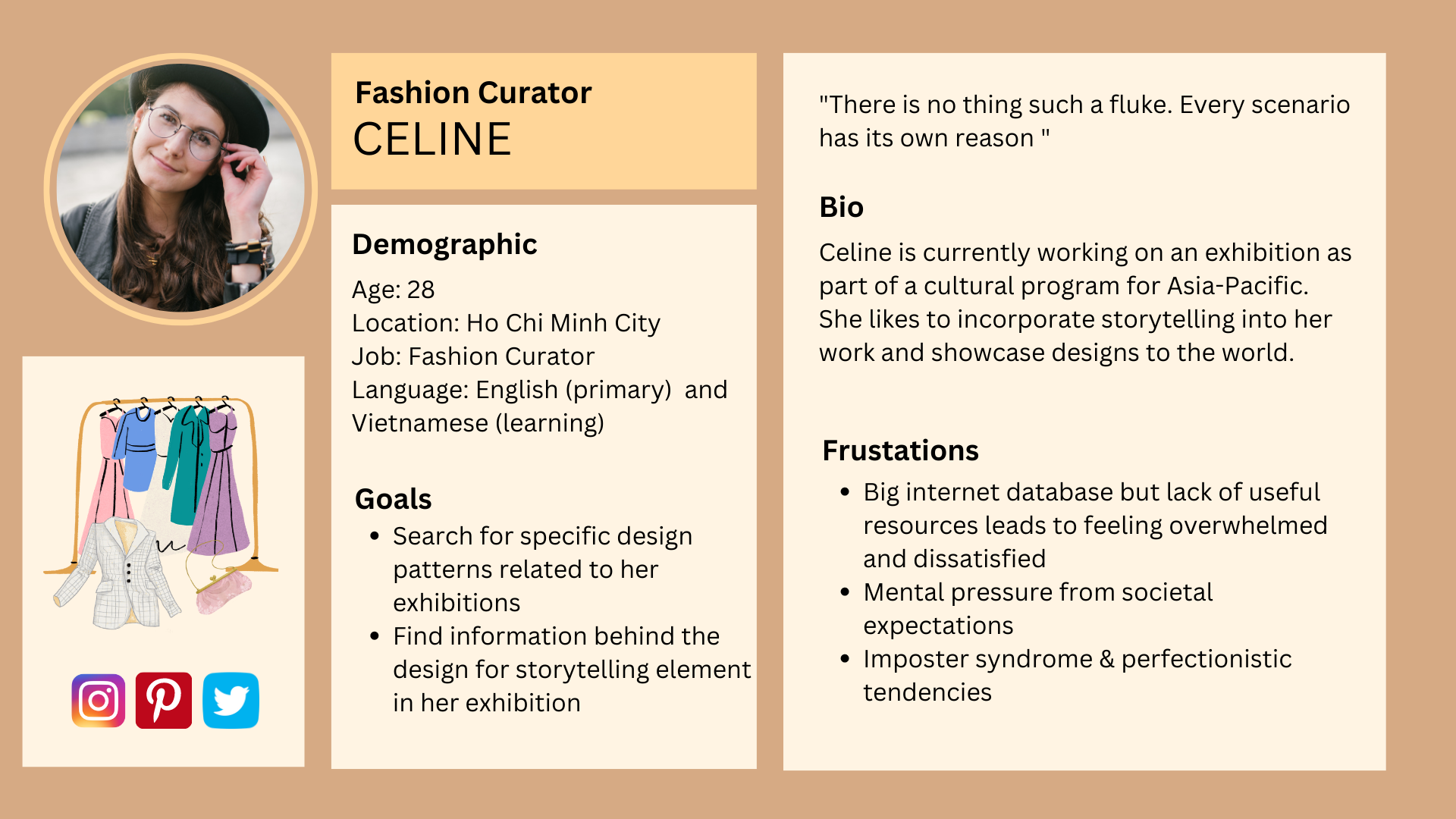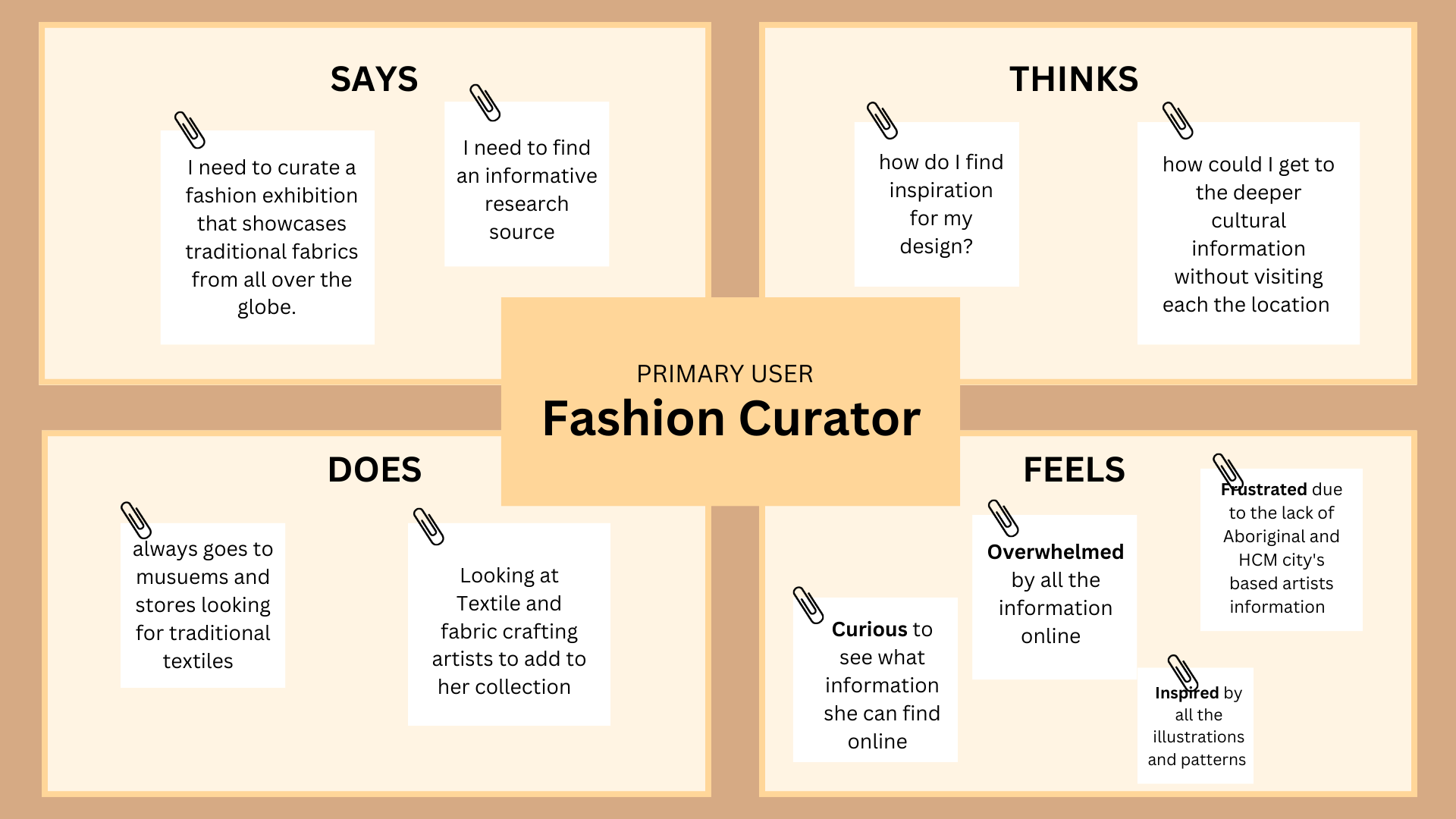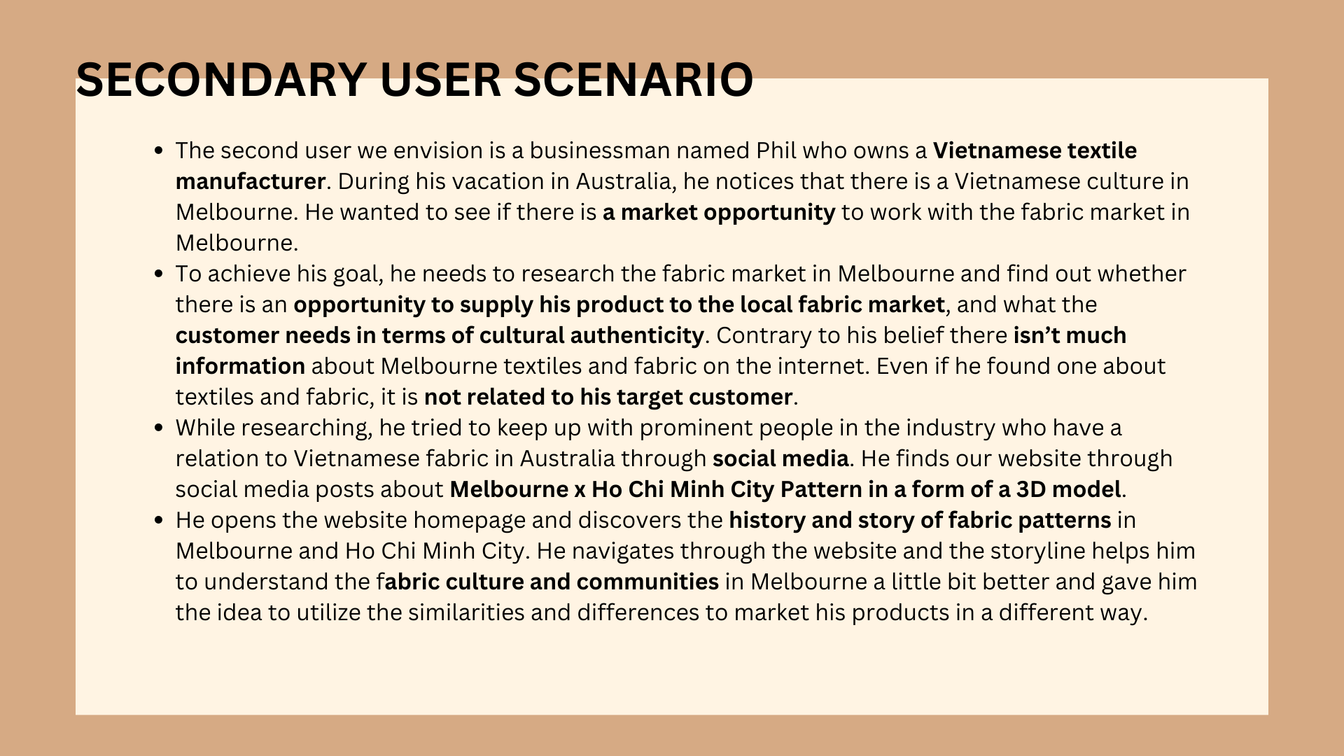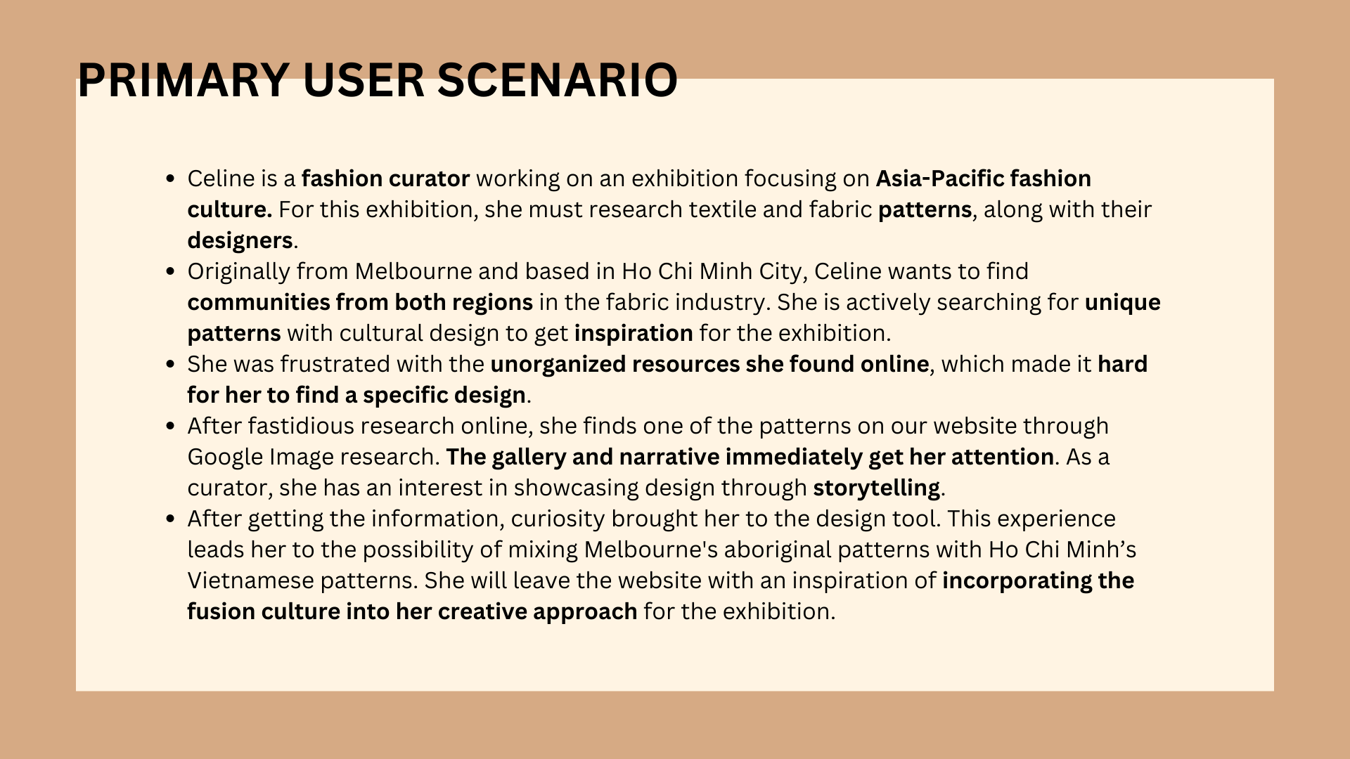 Fabric and pattern design are niche topics that not everyone is interested in. Therefore the users we are designing for must have a relation or long-term interest in the textile and fabric industry. If we were to compare the primary and secondary persona, the primary persona has a goal to find inspiration and information relating to fabric pattern design, while the secondary persona has a goal to find information about fabric culture and commercial potential.
