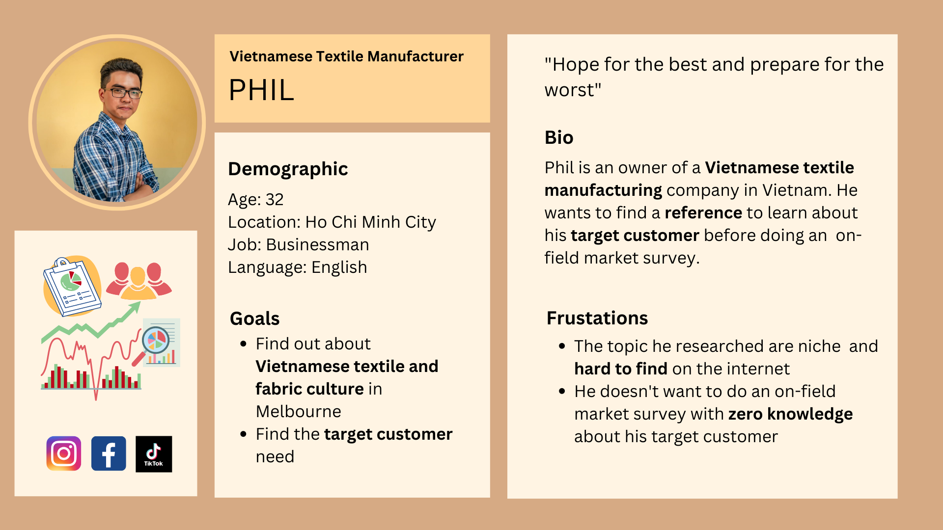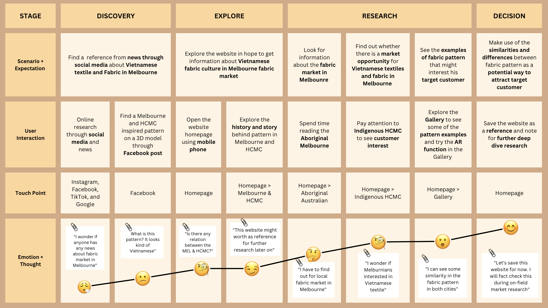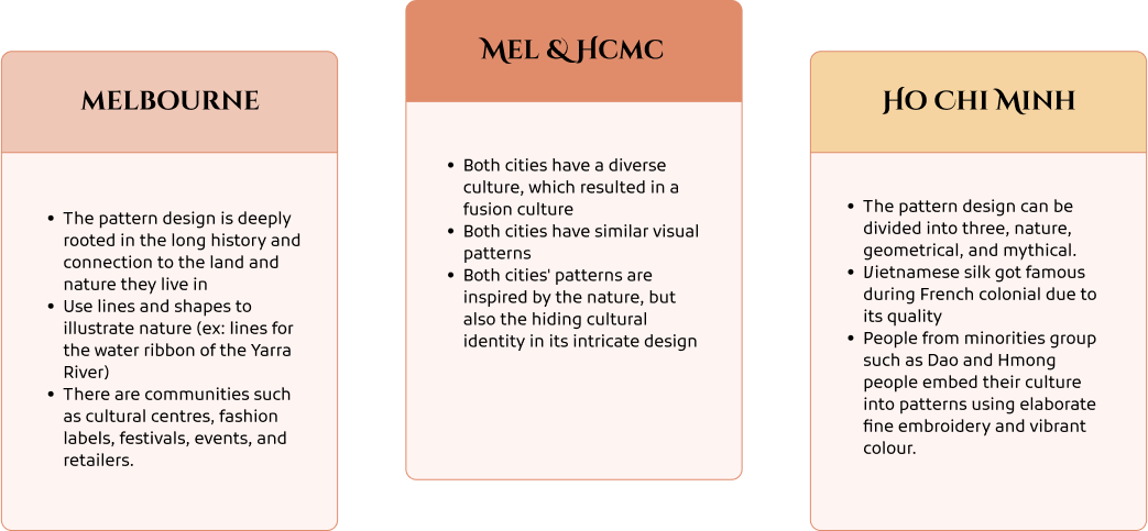 Melbourne and Ho Chi Minh City are melting points of cultures where people with different background gather together and live in. With this diversity, there are many similarity and differences between both cultures. In this project, my team and I took an approach to explore one of the culture in both cities that tourists tend to overlook, which is fabric and pattern design.