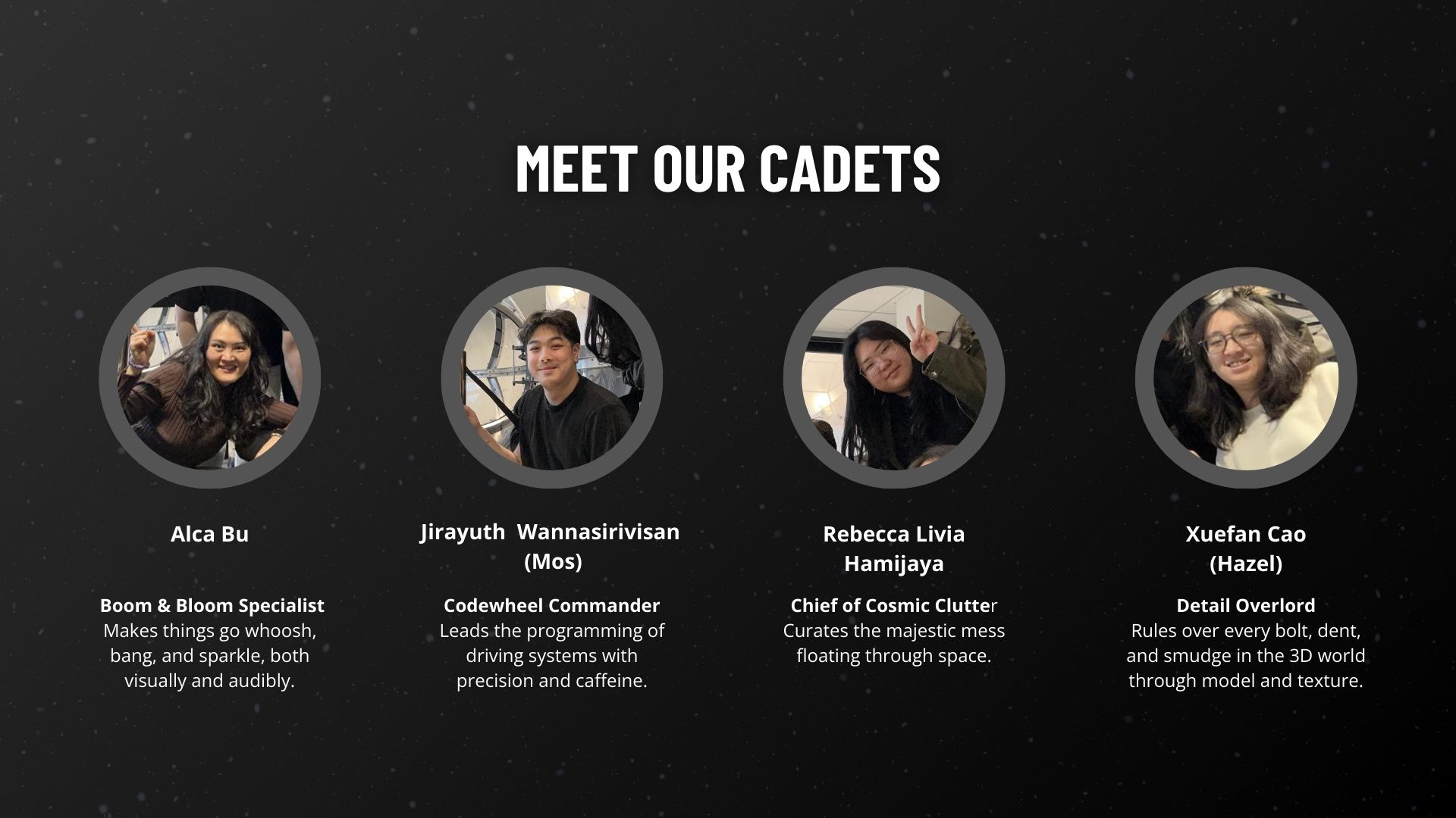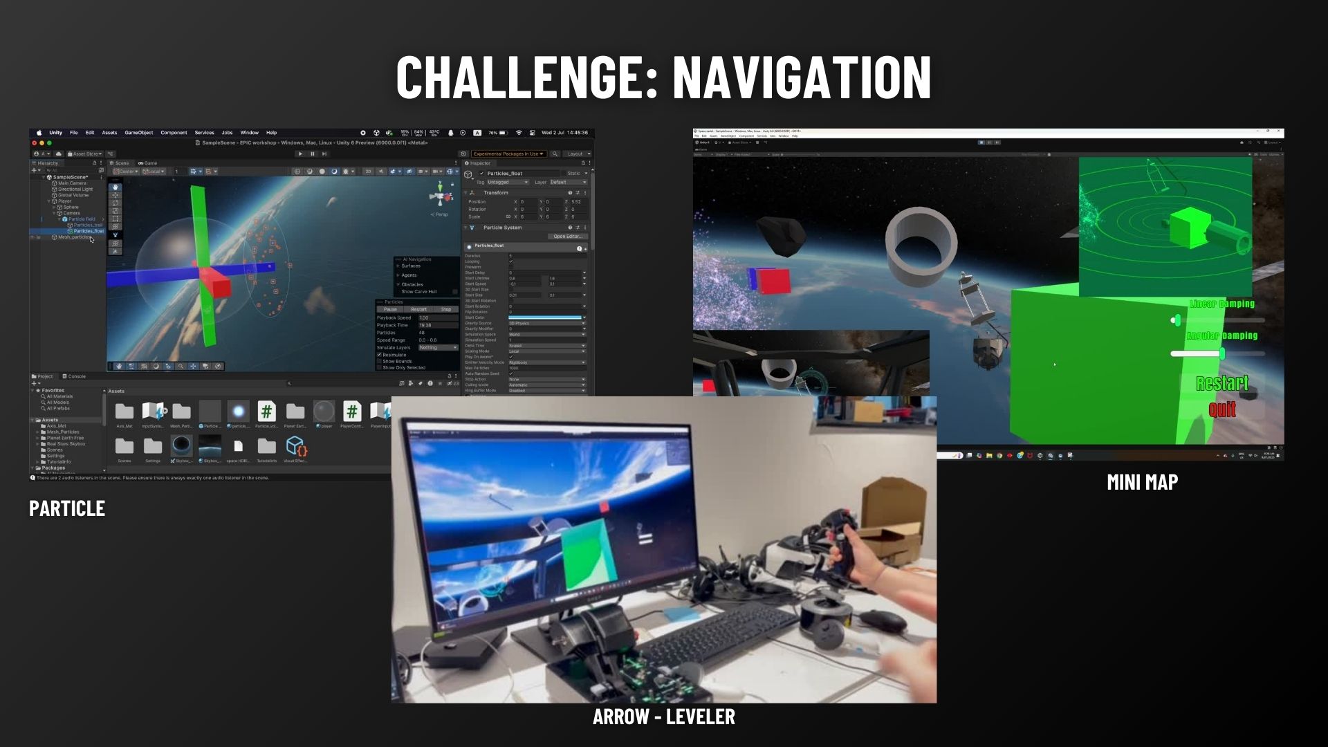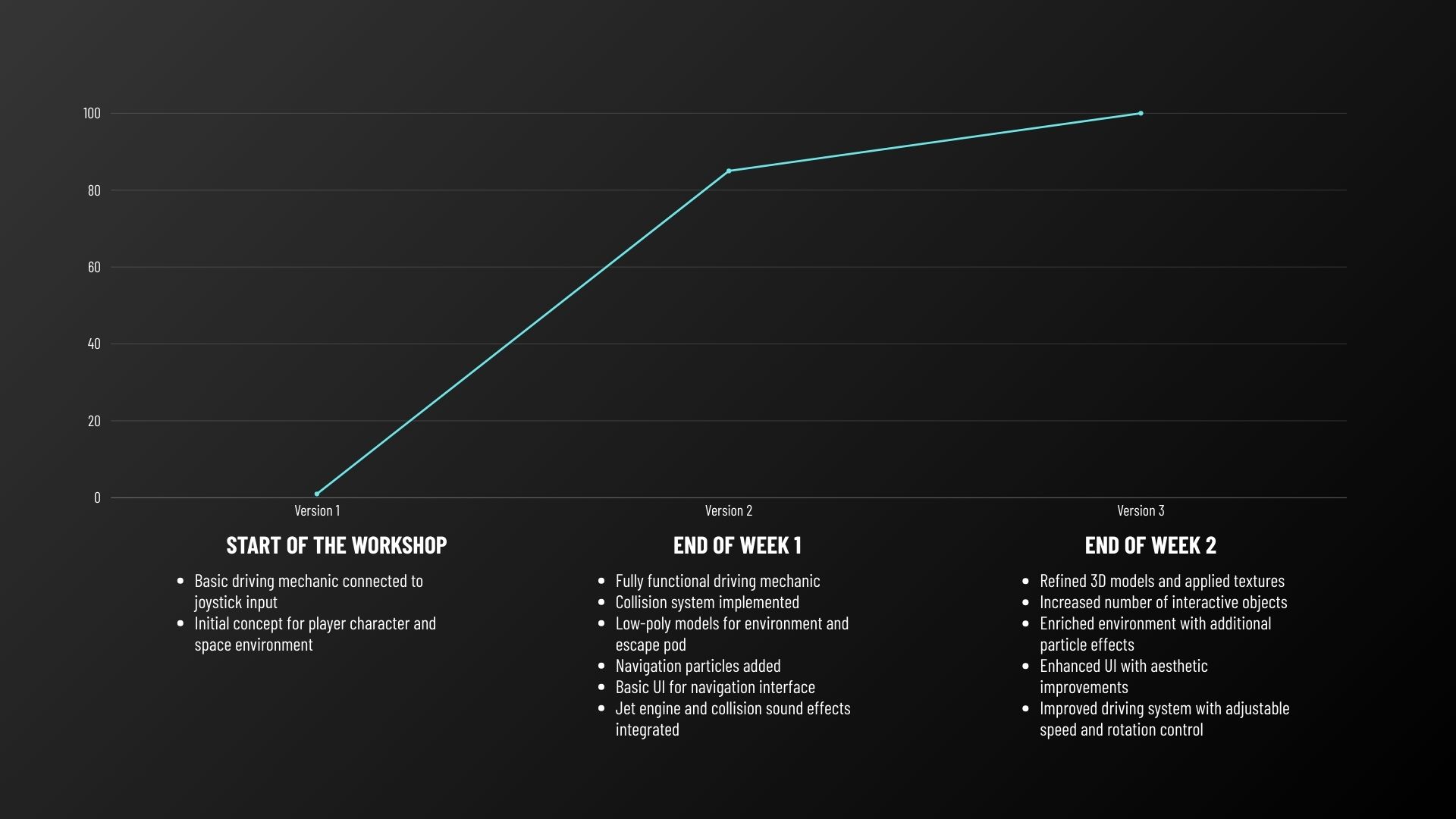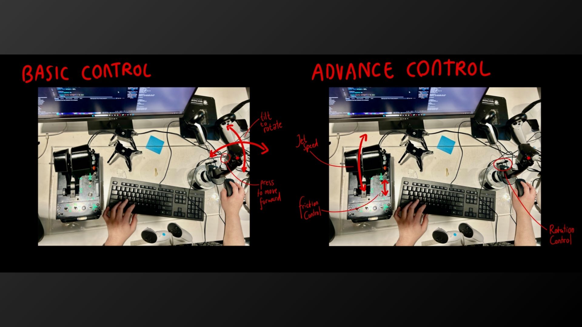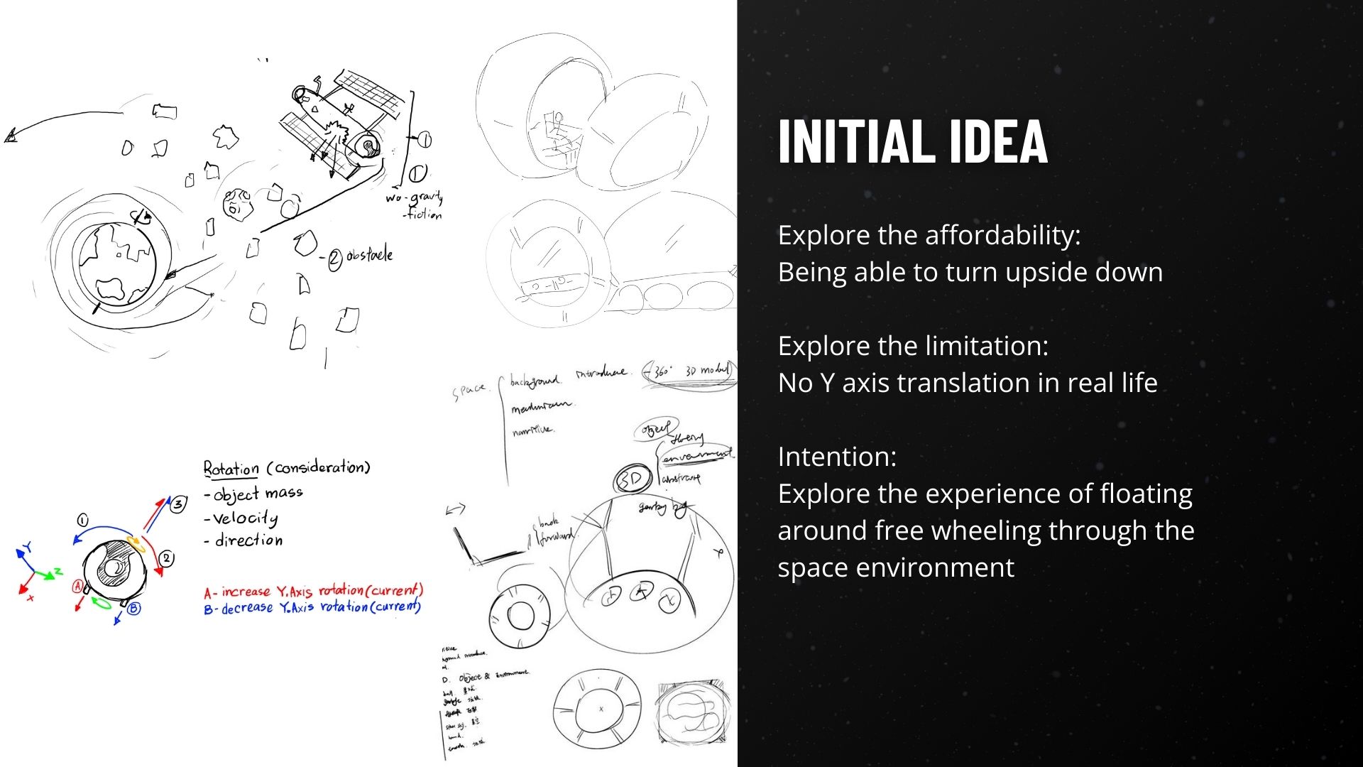 In the initial ideation stage, the group chose to explore the theme of space and zero gravity. This decision came from the realization that the simulator only supports movement along two axes (x and z), making it difficult to replicate vertical motion. Additionally, most previous projects created with this tool, such as car and helicopter simulators, focused on controlled movement. In contrast, this project aims to emulate a free-wheeling experience by using the simulator’s spinning mechanism within a zero-gravity space virtual environment.